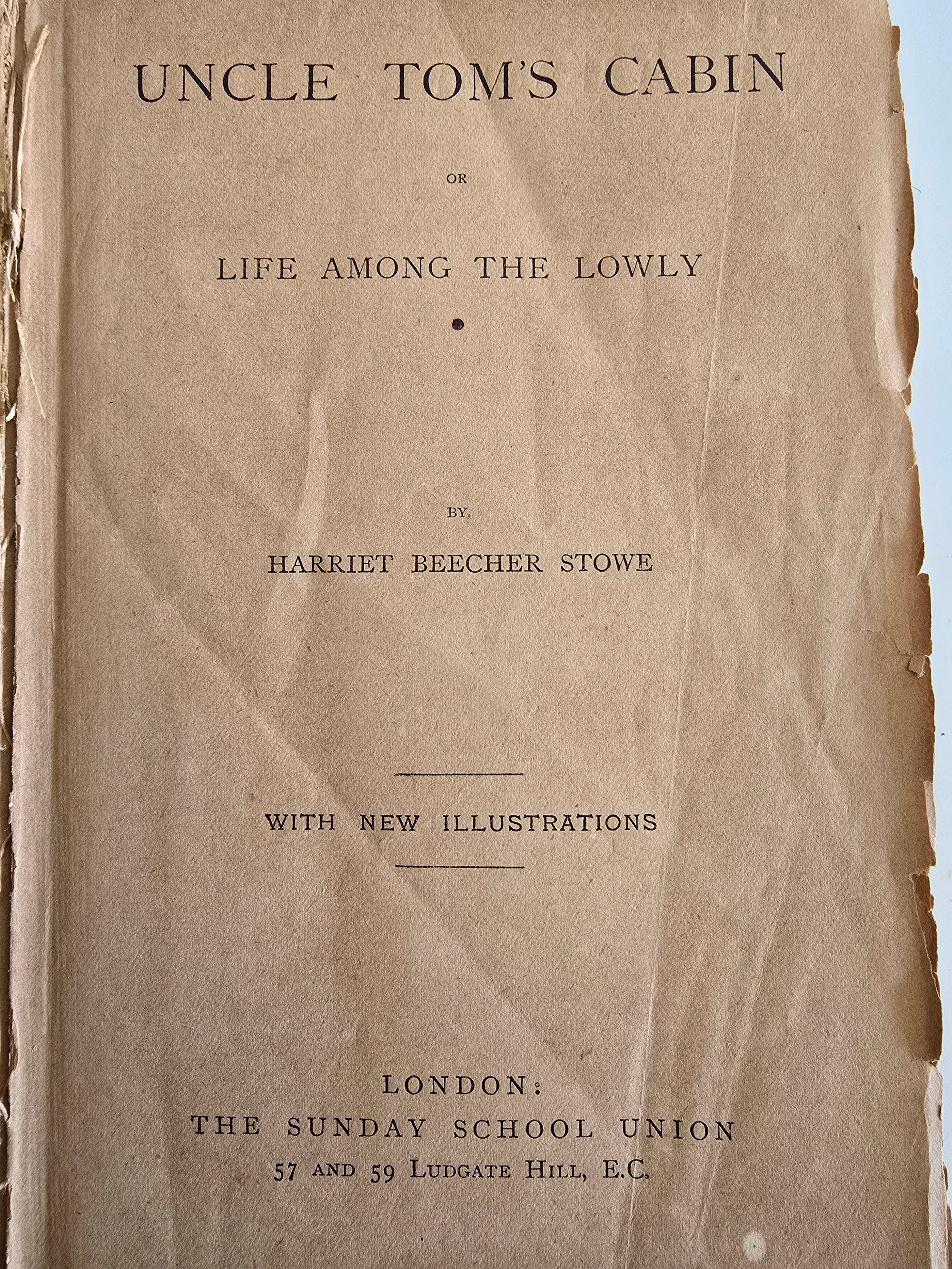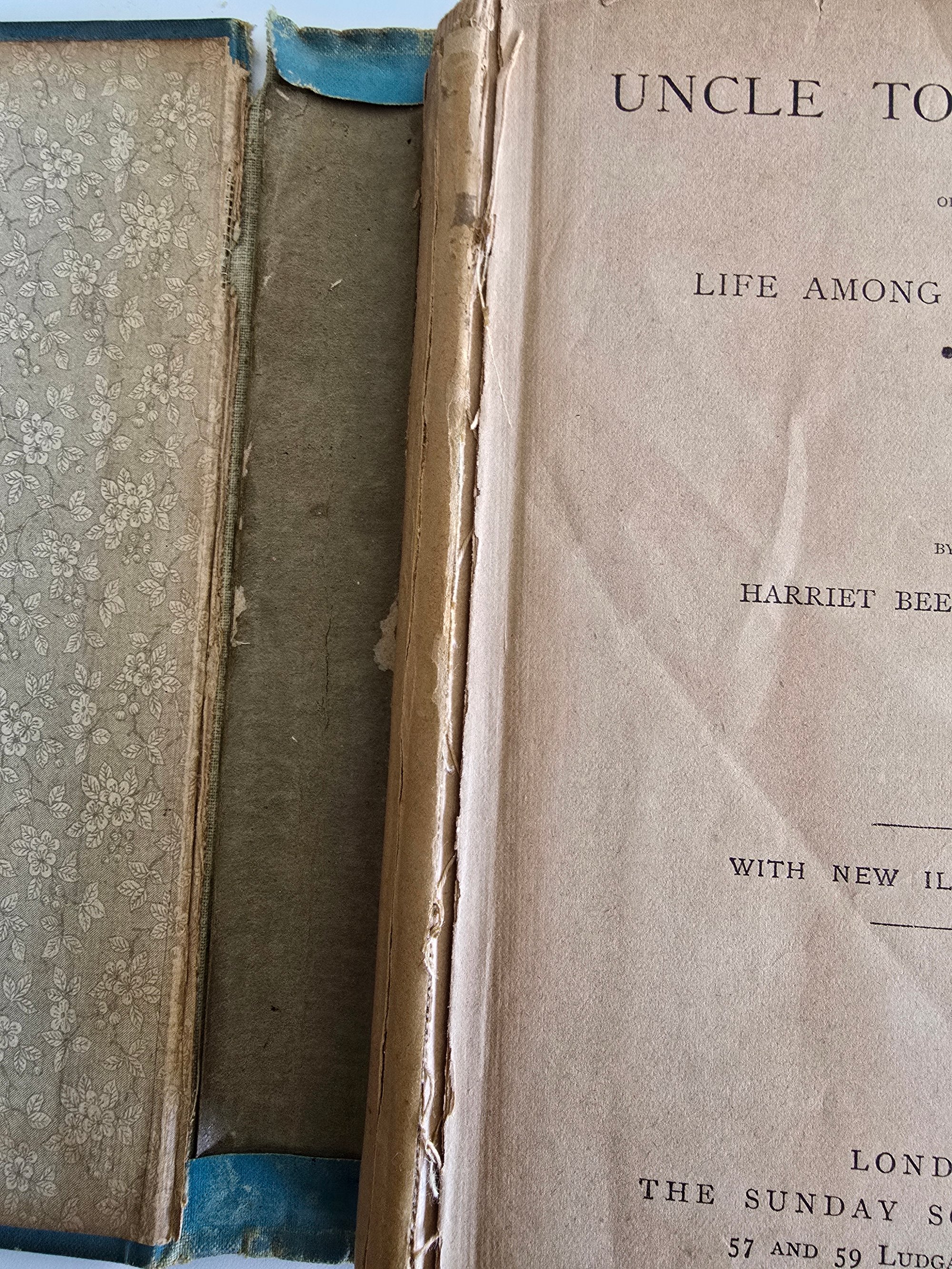 A beautifully timeworn antique copy of Uncle Tom’s Cabin by Harriet Beecher Stowe, dating to the late 19th century (March 1896 reference inside).