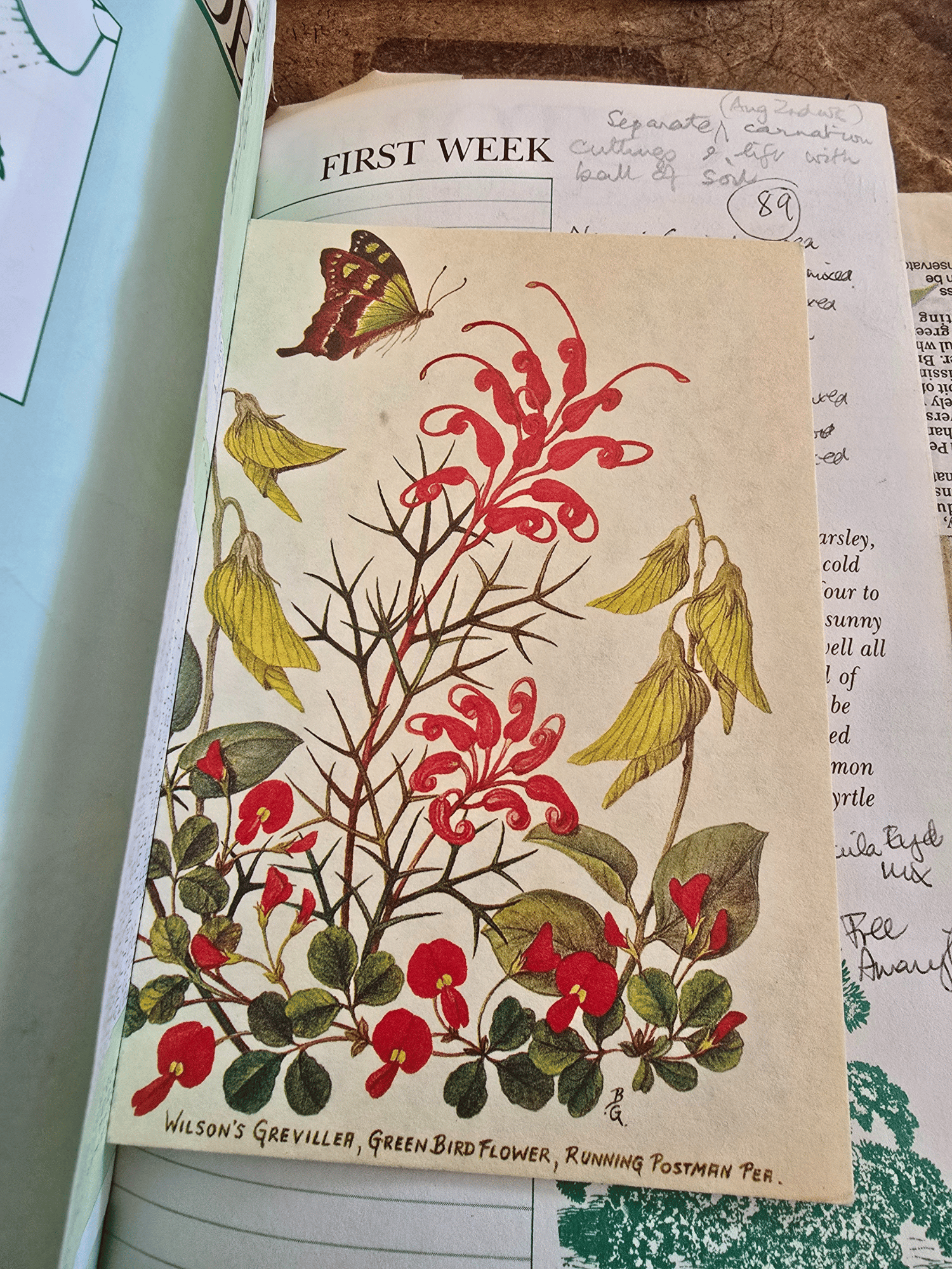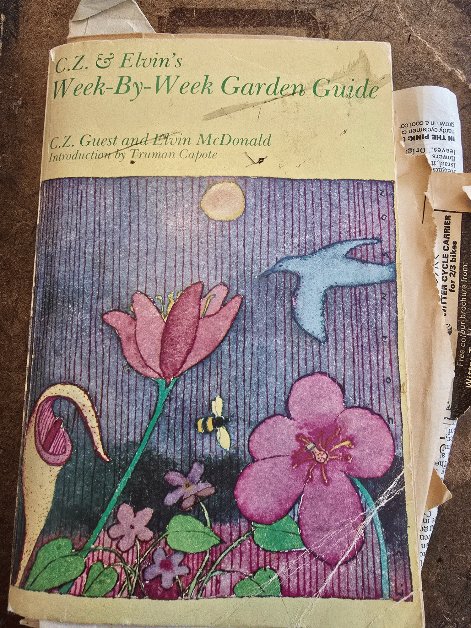 This is no ordinary gardening book. C.Z. & Elvin’s Week-By-Week Garden Guide (with an introduction by Truman Capote) is a vintage 1970s copy that has lived a full life in the hands of a devoted gardener. Its pages hold handwritten notes, seasonal planting reminders, and tucked-away clippings ranging from botanical prints to old newspaper cuttings and even a Hallmark Christmas card.
