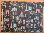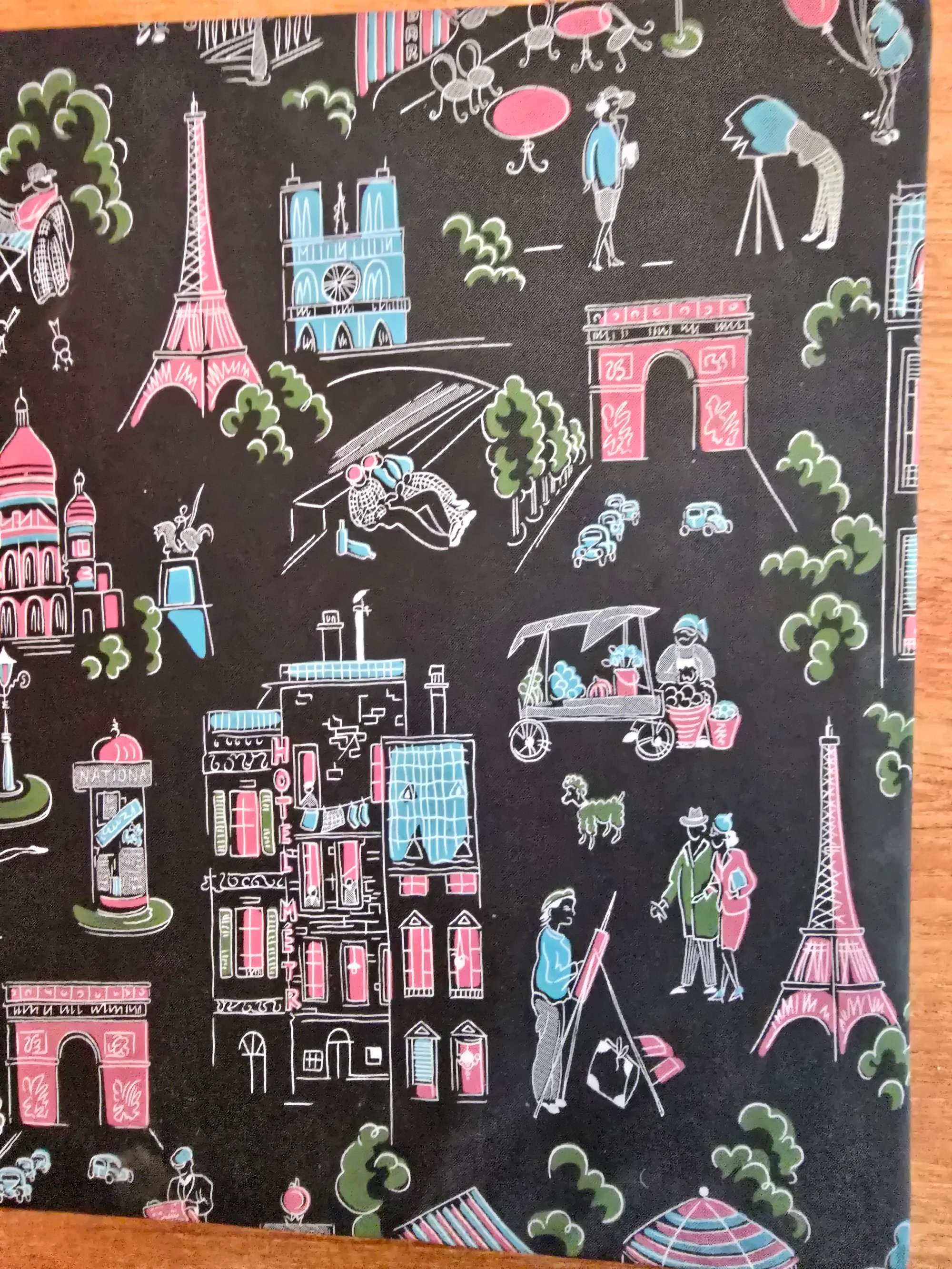 The cover is particularly lovely, a mid-century Paris-themed design with line-drawn scenes in soft pink, blue, and green against a black ground, giving it that graphic, slightly playful feel. It has a simple ring binding to the side, allowing the pages to sit flat and be explored easily.