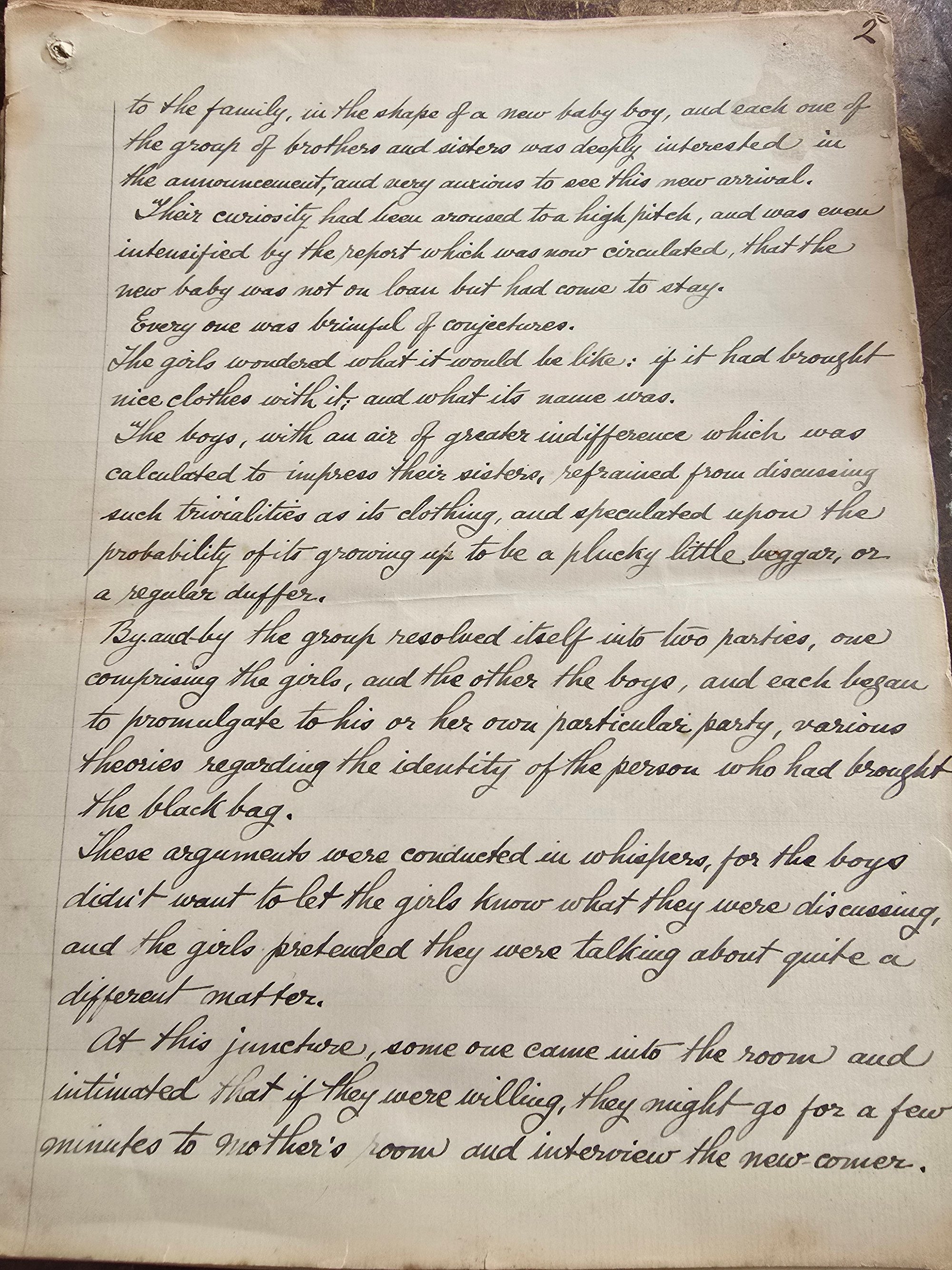 The text itself reads like part of a longer narrative, possibly a draft or copied manuscript, with references to family life and storytelling, adding an extra layer of intrigue and atmosphere.
