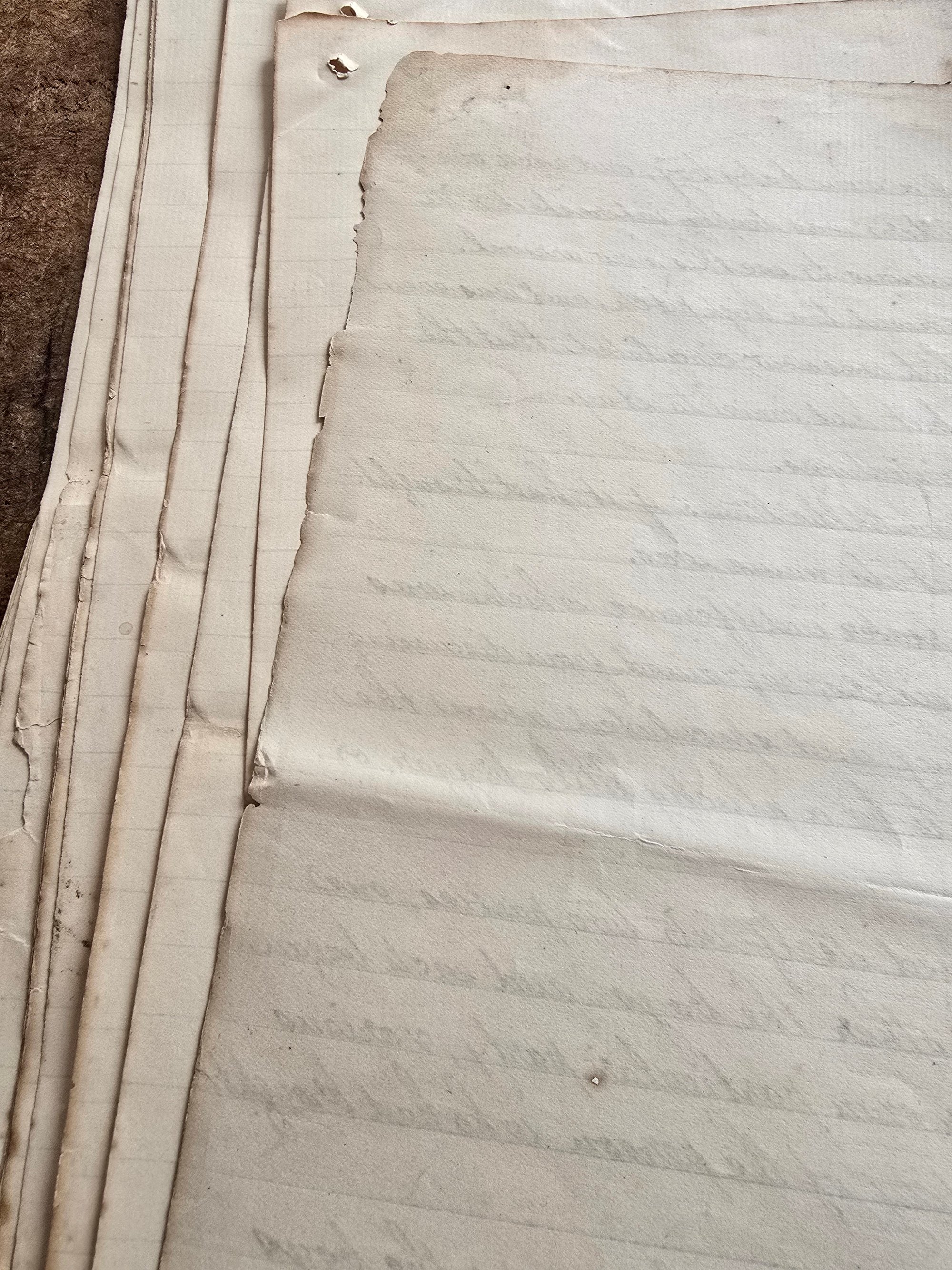A beautifully timeworn bundle of antique handwritten manuscript pages, filled with flowing cursive script and rich with character.