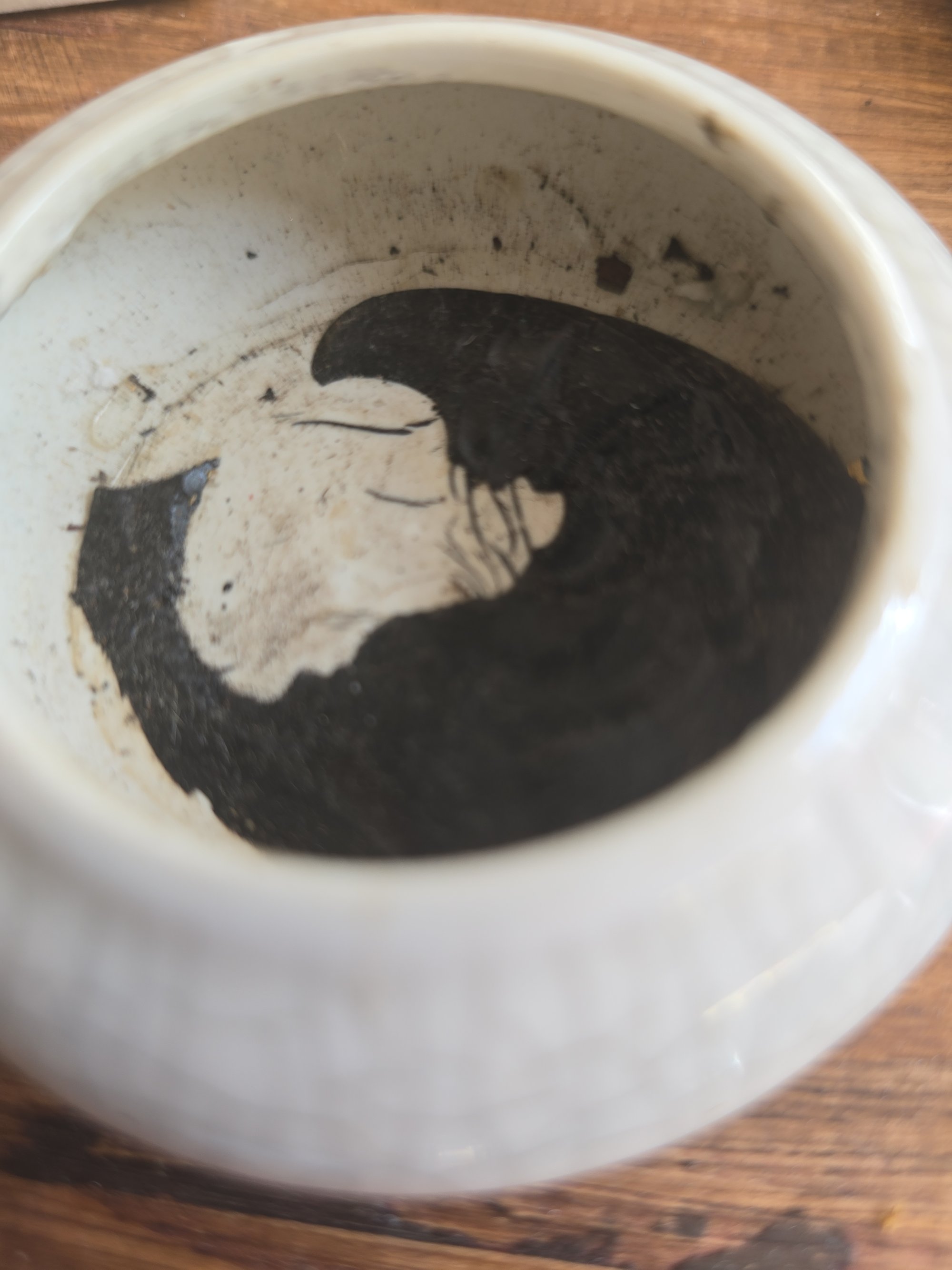 A beautiful vintage ceramic pigment dish, likely East Asian in origin, with a softly crackled glaze and visible traces of original black pigment settled into the base.
