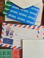 The graphics are particularly lovely, bold blues, reds, and greens, classic airmail stripes, and playful illustrated characters, making this just as appealing for display and collage as it is for nostalgic collecting.