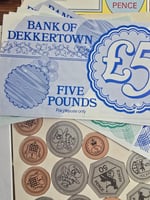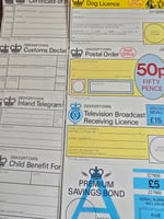 A mixed bundle including: airmail envelopes, plain envelopes, plain writing pad, stamp sheets and labels, postal order forms, custom forms, play bank notes, paper coins, small plastic stamp and pad.
