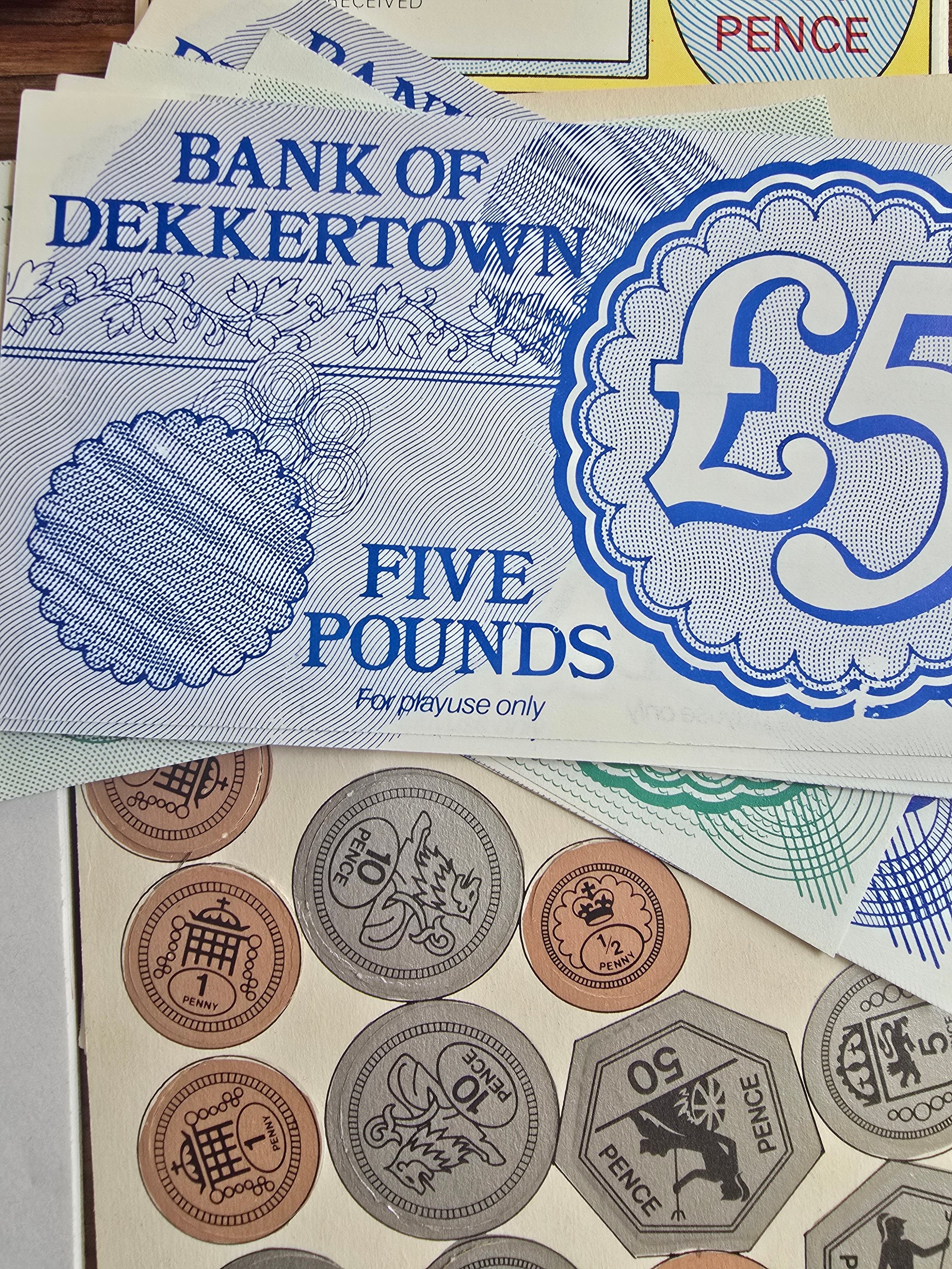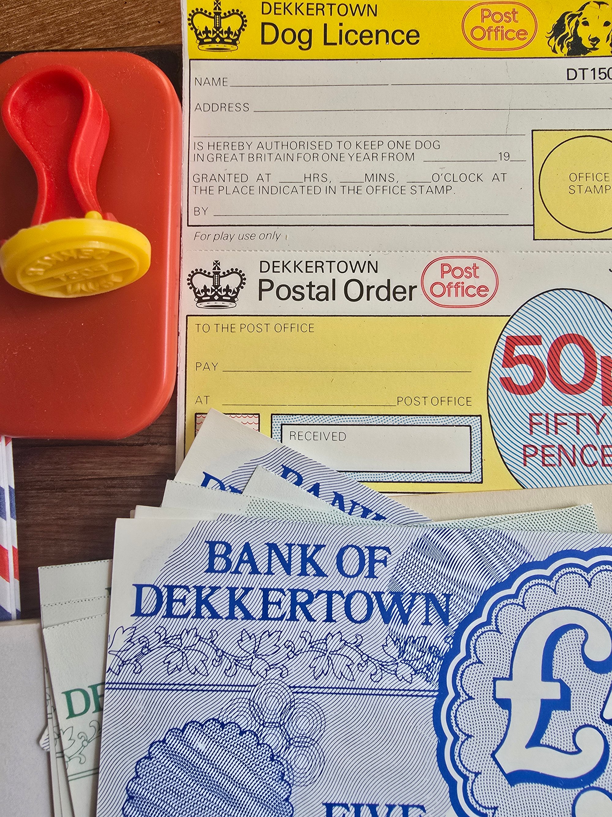 This set includes a mix of airmail envelopes, colourful stamp sheets, postal labels, play bank notes, postal order slips, and a small plastic stamp, all with that unmistakable mid-century to late 20th century design language.