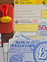 A charming vintage children's post office play set, filled with bright, graphic paper ephemera and small accessories, all echoing the look of real post office life.
