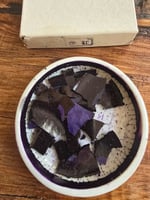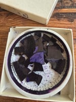 Shallower than the others in the set, this piece has a beautiful low profile with a softly crackled glaze and a dark stained rim where the pigment has settled over time. The remaining pigment has fractured into rich, inky shards, almost sculptural in itself, with tones shifting between black and violet.