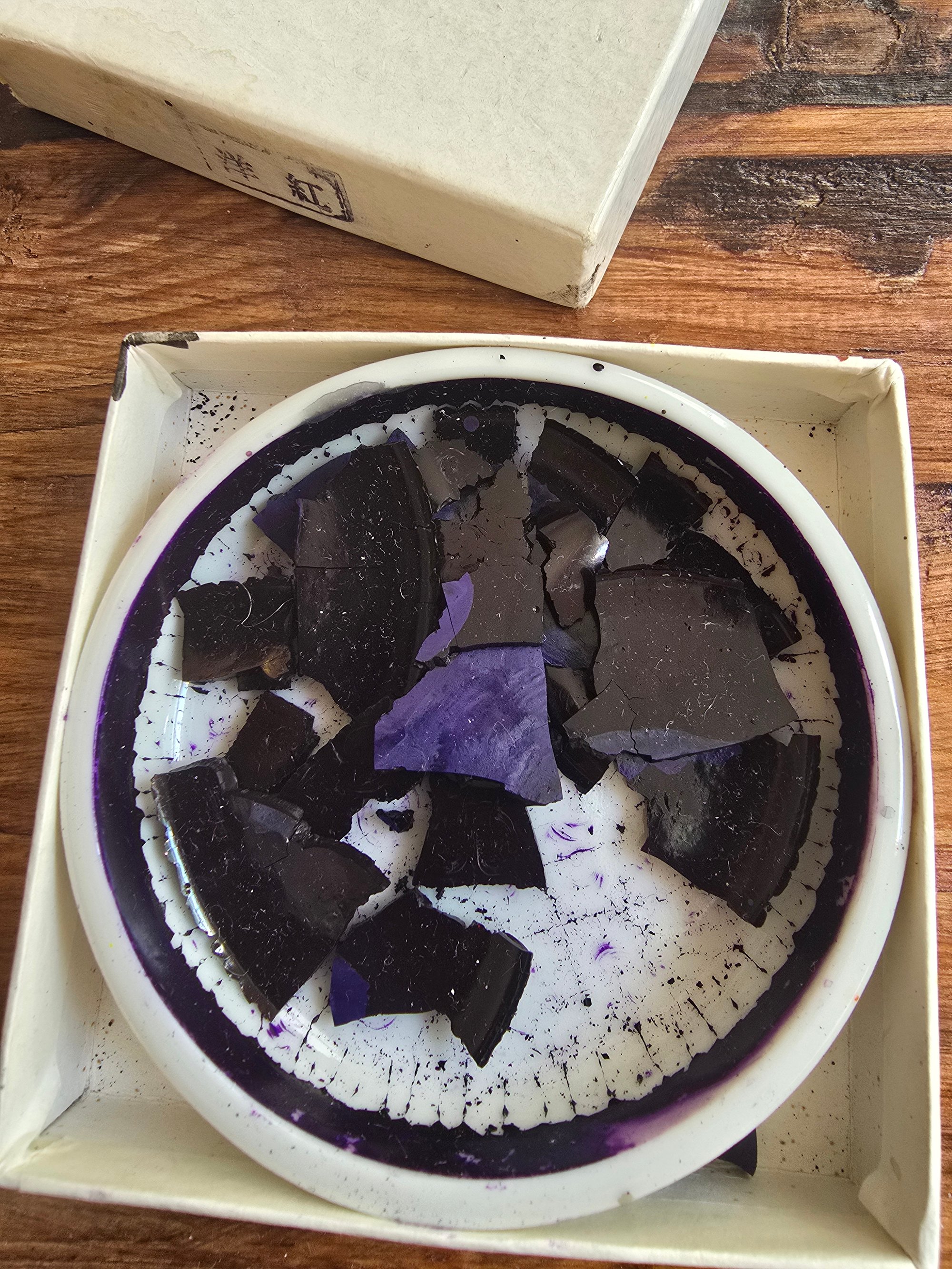A vintage Japanese ceramic pigment dish, found with its original paper box and still holding fragments of deep violet pigment.