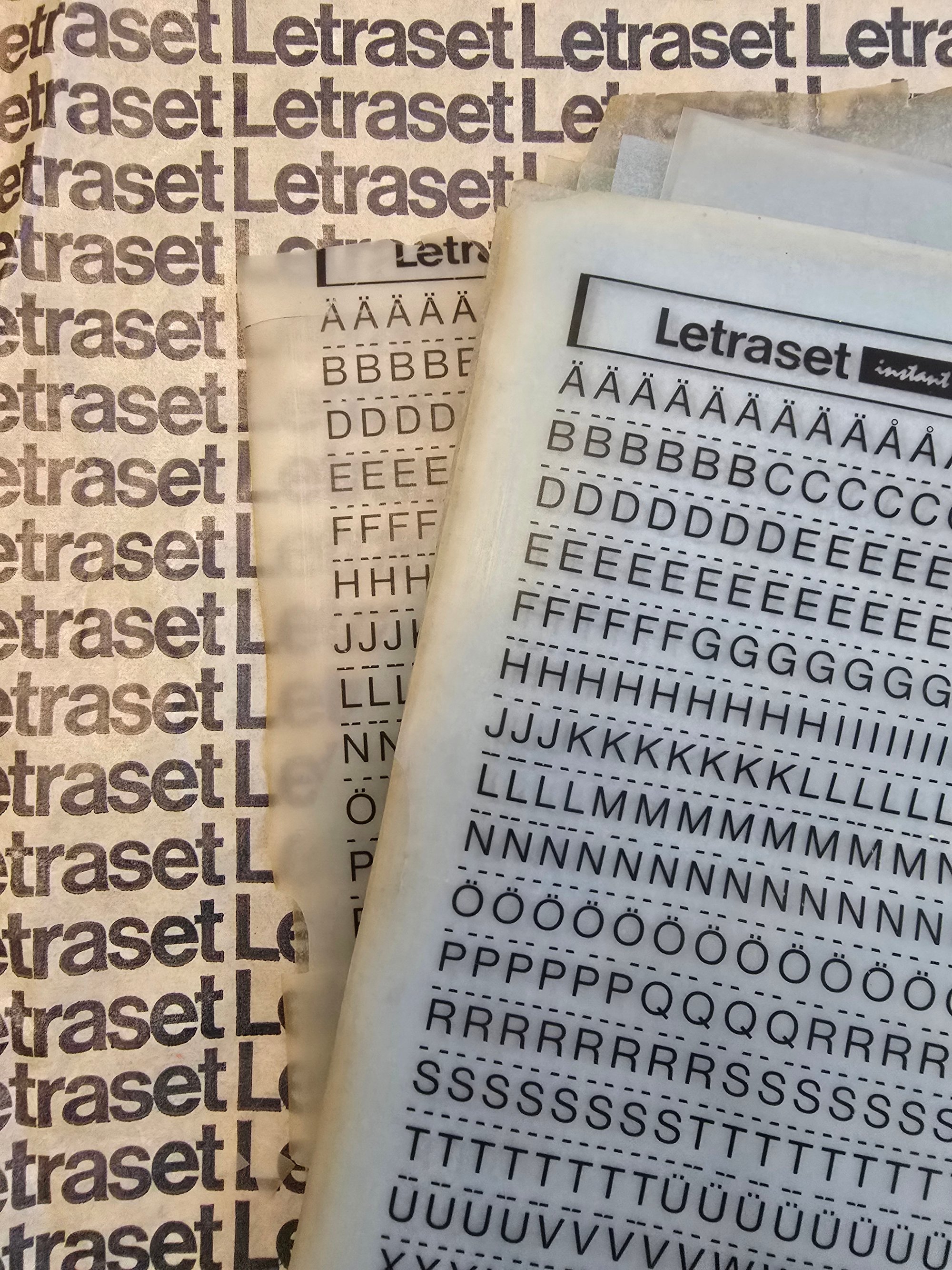 Vintage condition with some age-related creasing, light wear, and a few used sections on certain sheets. The original Letraset paper bag shows gentle surface wear consistent with age.