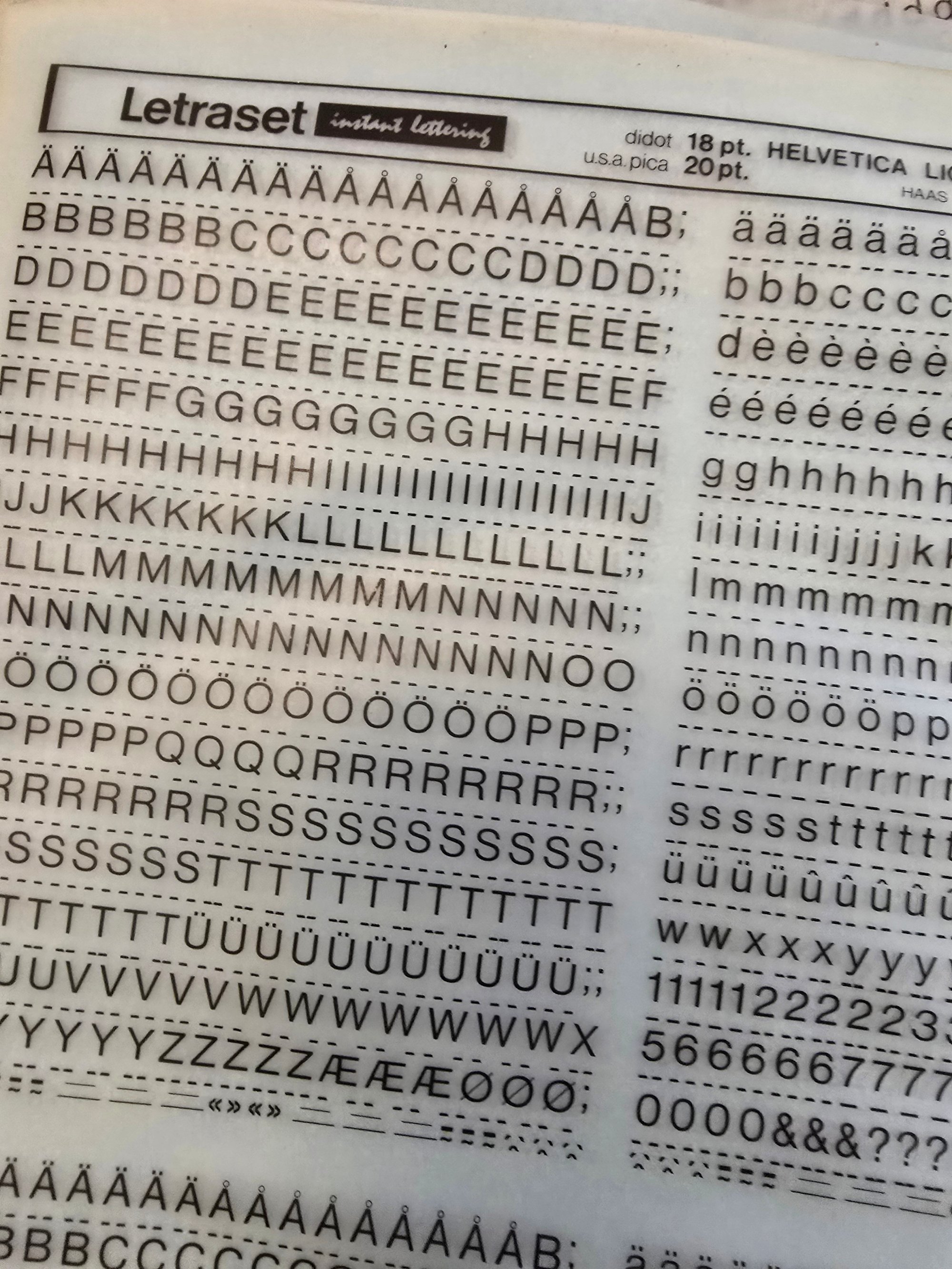 A vintage collection of Letraset instant lettering sheets in their original printed paper bag, featuring Helvetica Light 18pt and other classic typefaces. These dry transfer sheets were once essential studio tools for graphic designers, typographers, and illustrators. The pack includes multiple sheets (some partially used, others near full) showcasing crisp black lettering on clear backing paper, along with the distinctive repeat-print Letraset packaging.