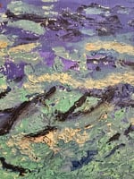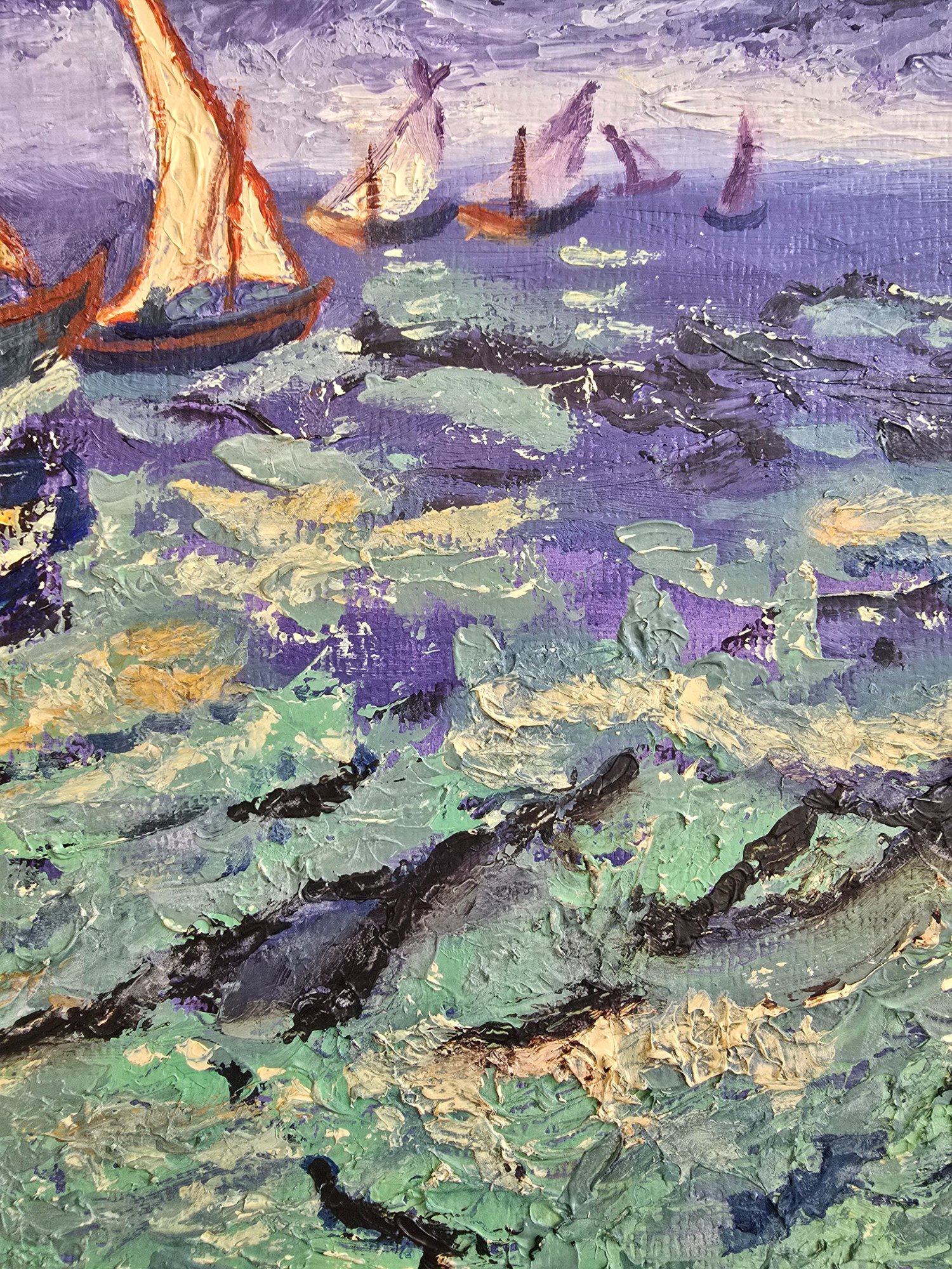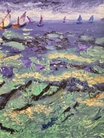 A vibrant vintage seascape painted with expressive, heavily textured strokes. Shades of green, blue, violet, and ochre create a lively depiction of sailing boats against a moody sky. The thick impasto surface gives the scene energy and movement, capturing the drama of the sea.